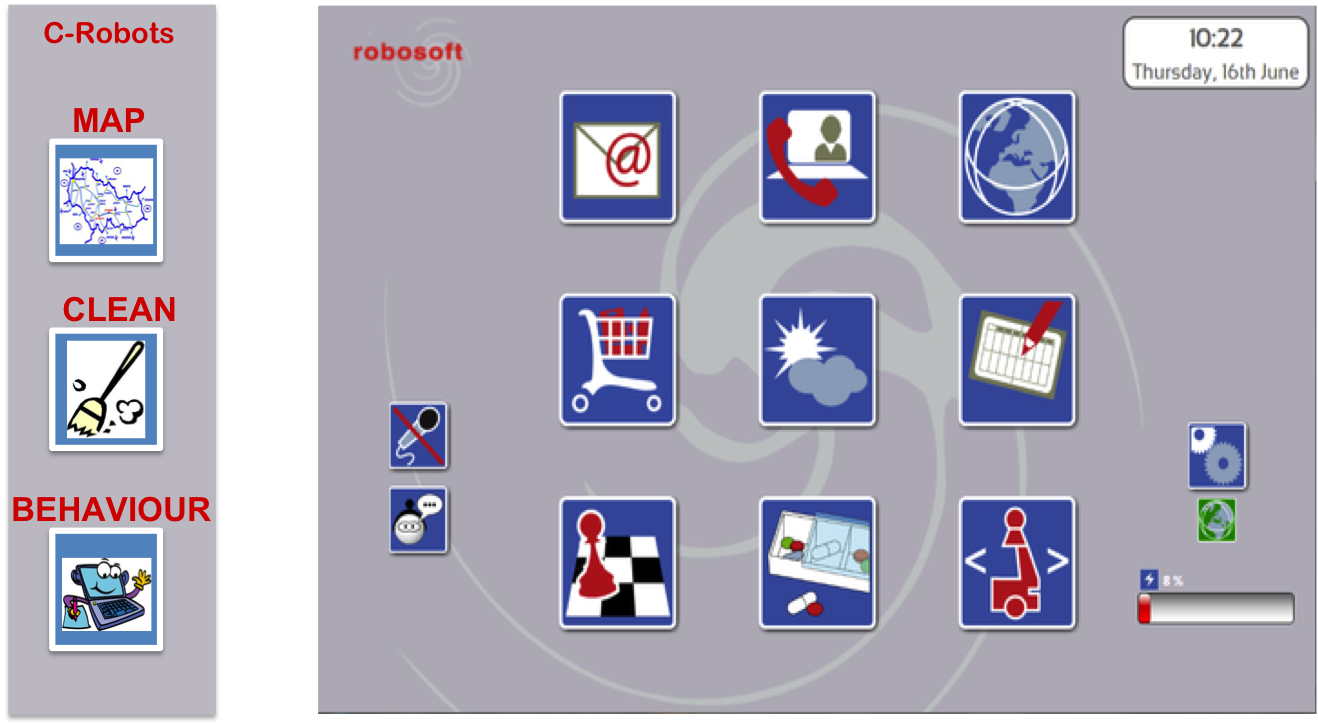 Figure 1. a) Kompai’s original GUI; b) Extended functionalities provided by C-Brain for the project.