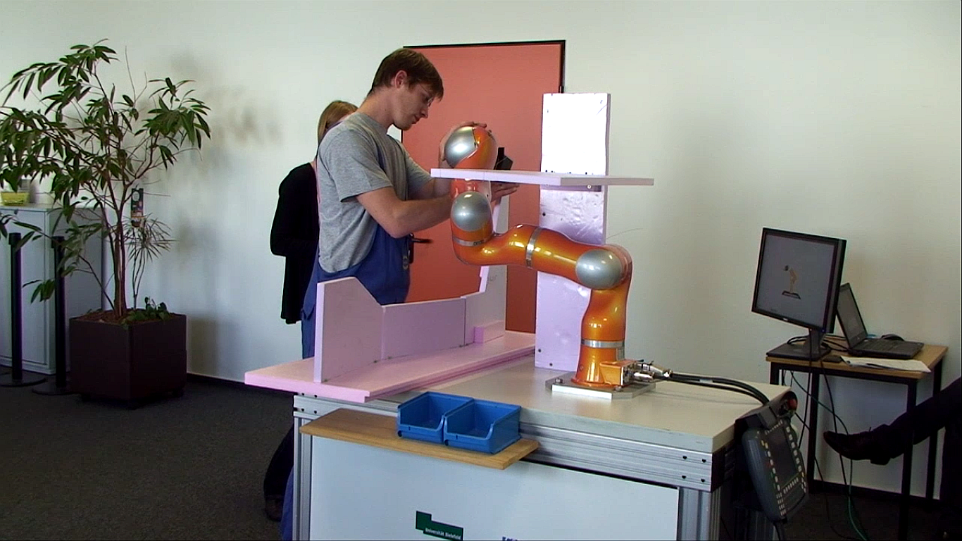 The results are very convincing. First of all, the users felt not threatened by the robot and perceived it to be reliable, which is an important fact regarding the applicability in future industrial co-worker scenarios. Concerning the physical interaction, they stated that the robot was easy and comfortable to handle as well as the operation of the robot to be self-explanatory. Additionally, they felt the system to give helpful feedback during the collaboration.
