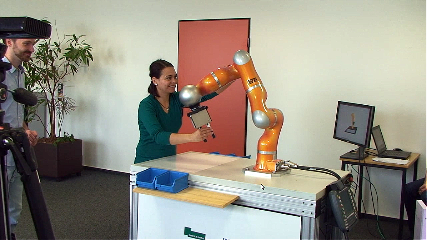 As reported earlier, we conducted the study to answer questions concerning the perception and manageability of the FlexIRob system. In particular: Is such a physical MMI actually intuitive? For all users? Is it comfortable? How exhausting is the work with the robot arm?  Is the recon guration of the robot practicable? How well and how fast can it be done?  What are the characteristics of the training data provided by the naive users of the system?