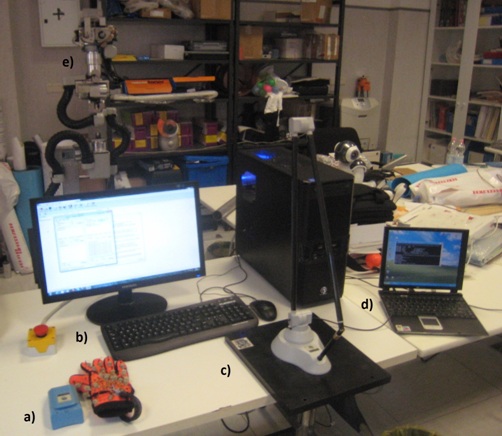 Figura 1. The experimental setup: a) Dataglove, b) Control desktop PC, c) Motion tracker, d) Communication laptop PC, e) Robotic platform